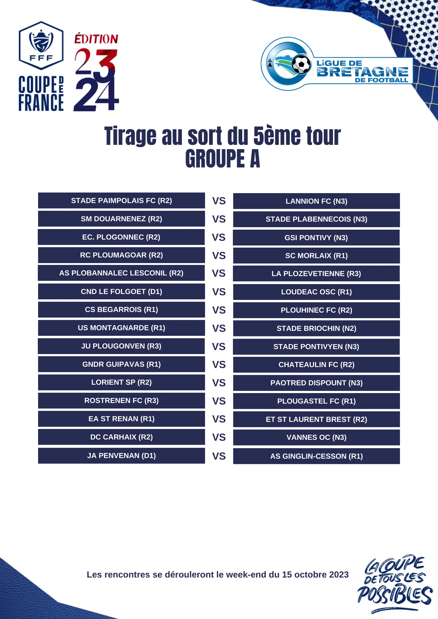 Le tirage au sort des matches pour le cinquième tour s'est déroulé mercredi soir, au siège de la ligue de Bretagne, à Montgermont. 30 rencontres seront à suivre le week-end des 14 et 15 octobre 2023, ce tour-ci est marqué par l'entrée en lice des clubs de National.