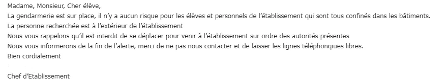 Dans un mail destiné aux parents, le chef d'établissement assure qu'il "n'y a aucun risque pour les élèves et personnes de l'établissement qui sont tous confinés dans les bâtiments". Tous les enfants ont été conservés pour le déjeuner.